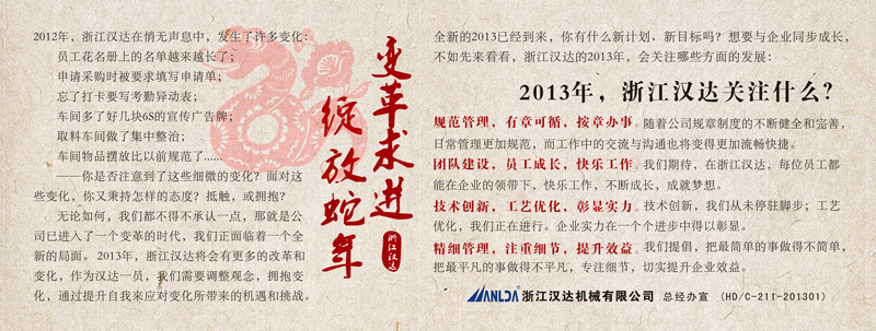 2013年,浙江漢達(dá)將從規(guī)范管理、團(tuán)隊(duì)建設(shè)、技術(shù)創(chuàng)新、精細(xì)管理四個(gè)方面著力,目的在于為客戶提供更具價(jià)值的產(chǎn)品、更貼心的服務(wù),為員工提供更好的發(fā)展平臺(tái)、更多可能性的未來。