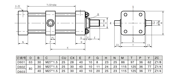 中間銷(xiāo)軸安裝的低壓拉桿液壓缸的尺寸圖及參數(shù)